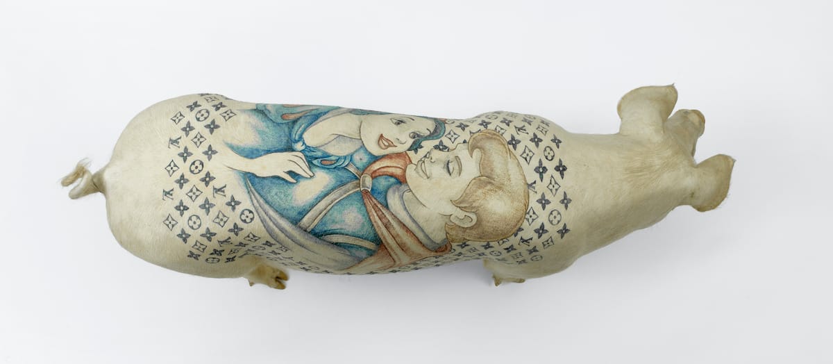 Lors d’un séjour à Cuba, à la suite d’une discussion avec un ami cubain, le plasticien belge Wim Delvoye décide d’utiliser son penchant pour le tatouage dans son travail. « Tu sais, Fidel Castro parle de libéraliser le régime, mais la seule concession qu’il veut bien faire à la population, c’est de permettre d’avoir un cochon dans chaque maison. ». Dans la tête de l’artiste se tisse rapidement un lien entre l’animal, symbole capitaliste en régime communiste permettant l’épargne et une oeuvre d’art dont des collectionneurs fétichistes pourraient attendre la même chose : une plus-value dans le temps. Wim Delvoye se met alors en tête de tatouer des cochons. Mais ce simple acte n’est pas assez percutant pour lui. Il crée alors son “Art Farm”, qu’il monte très facilement en chine. Un lieu dans lequel il élève ses propres bêtes dans l’unique but de les tatouer au rythme de quelques heures par jour. Après la mort d'un animal, sa peau est récupérée et exposée, ou alors la bête est empaillée. Elles peuvent aussi être vendues. On peut se demander ce qui pousse Wim Delvoye dans cette entreprise sommes toute particulièrement étonnante.