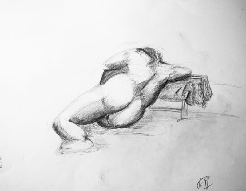 Je dirais tout d’abord qu’il s’agit d’une pratique assez complexe. Il s’agit en effet de capter assez rapidement la forme, l’attitude générale du modèle et de coucher ça le plus rapidement possible sur papier. Et bien sûr, il vaut mieux respecter un minimum de proportions, histoire d’avoir un dessin un rien cohérent. Malgré tout, le croquis de nu est vraiment une pratique que j’aime. Outre l’aspect exercice et technique, il y a quelque chose d’intéressant dans le fait de se retrouver devant un modèle sans artifices et de devoir seulement se concentrer sur les formes du corps, les ombres et le tout assez rapidement.
