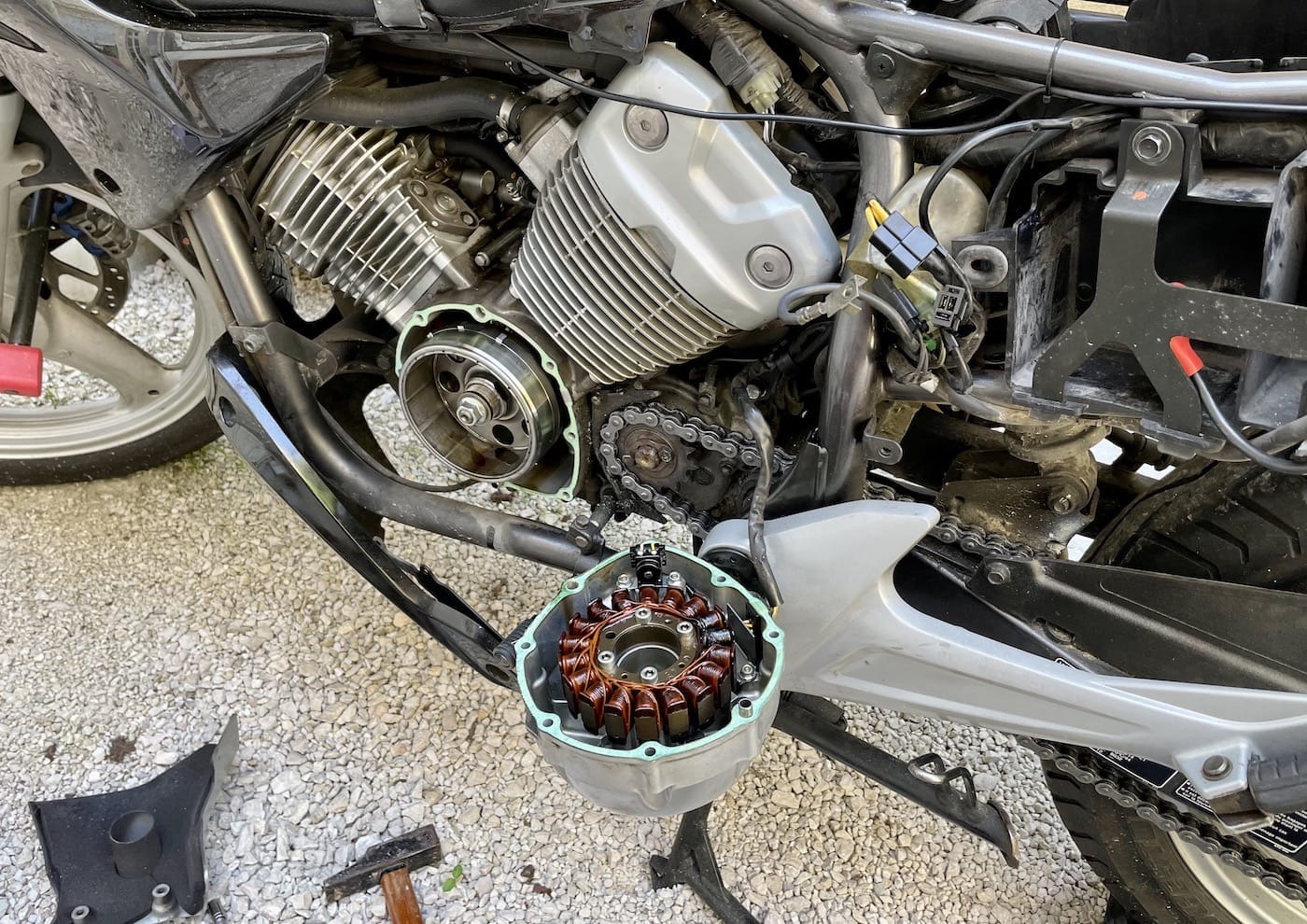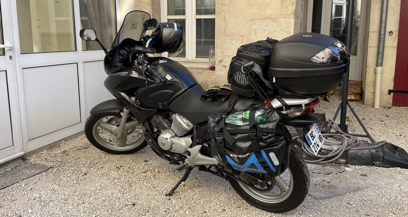 Puis ça fini par rentrer un peu. Je me donne des objectifs. Faire attention aux vitesses. Au regard quand je m’arrête, à la trajectoire. Au dosage du frein avant, d’abord seul. Puis le frein avant et arrière combiné... Etc. Ce qui m’a le plus déridé, c’est mon premier « long » trajet de Paris à Dijon (5h30) une dizaine de jours après l'achat. Ça m’angoissait pas mal, d’autant que je partais chargé. Au bout de quelques heures, le plaisir commençait à remplacer la crainte et tout me semblait beaucoup plus fluide. Comme quoi… il faut rouler ! Du moins jusqu’au moment où mon alternateur a lâché sans prévenir en plein centre-ville. Mais ça, c’est une autre histoire (et entre temps, je l’ai changé).