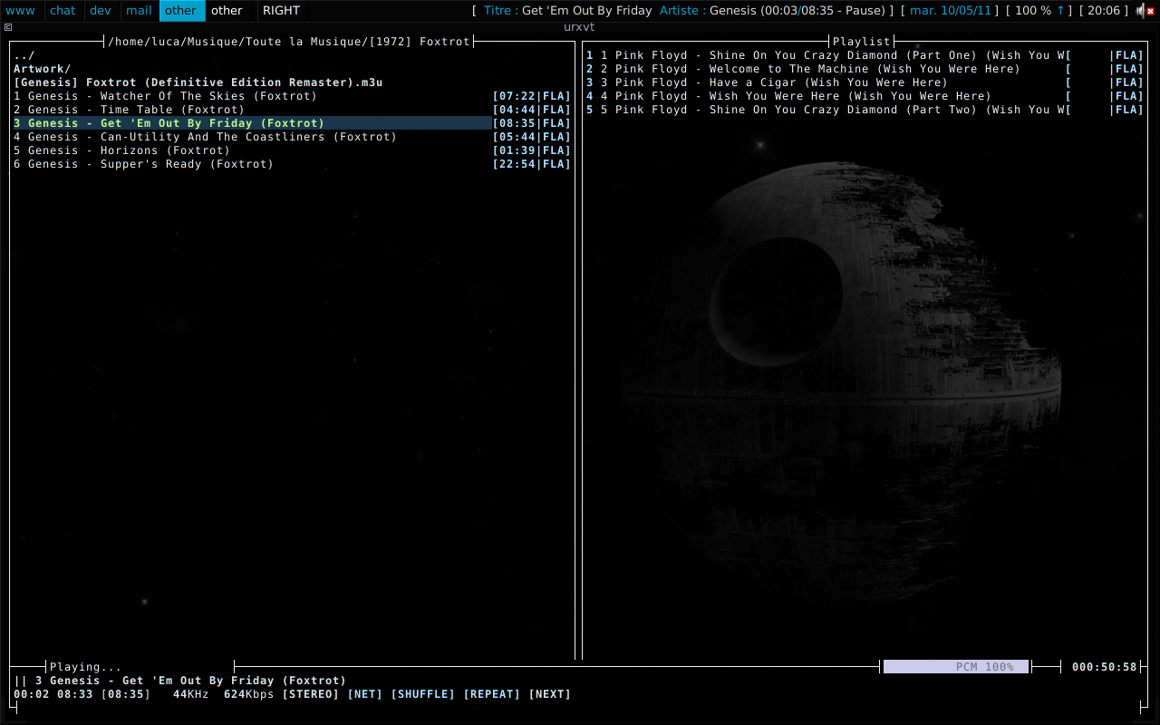 mocp -xPar ailleurs, vous pouvez controler moc directement depuis votre terminal. C’est ce qui va d’ailleurs nous permettre d’intégrer Music On Console à WMFS.