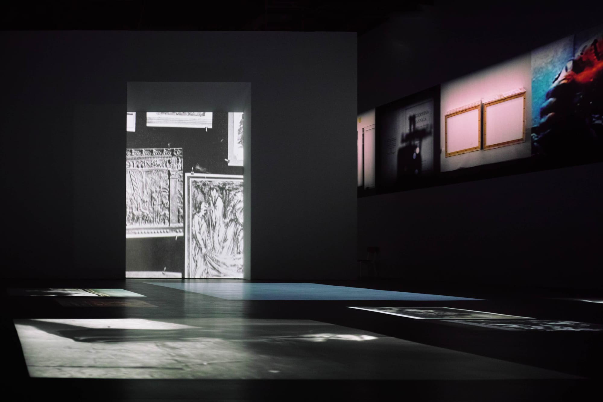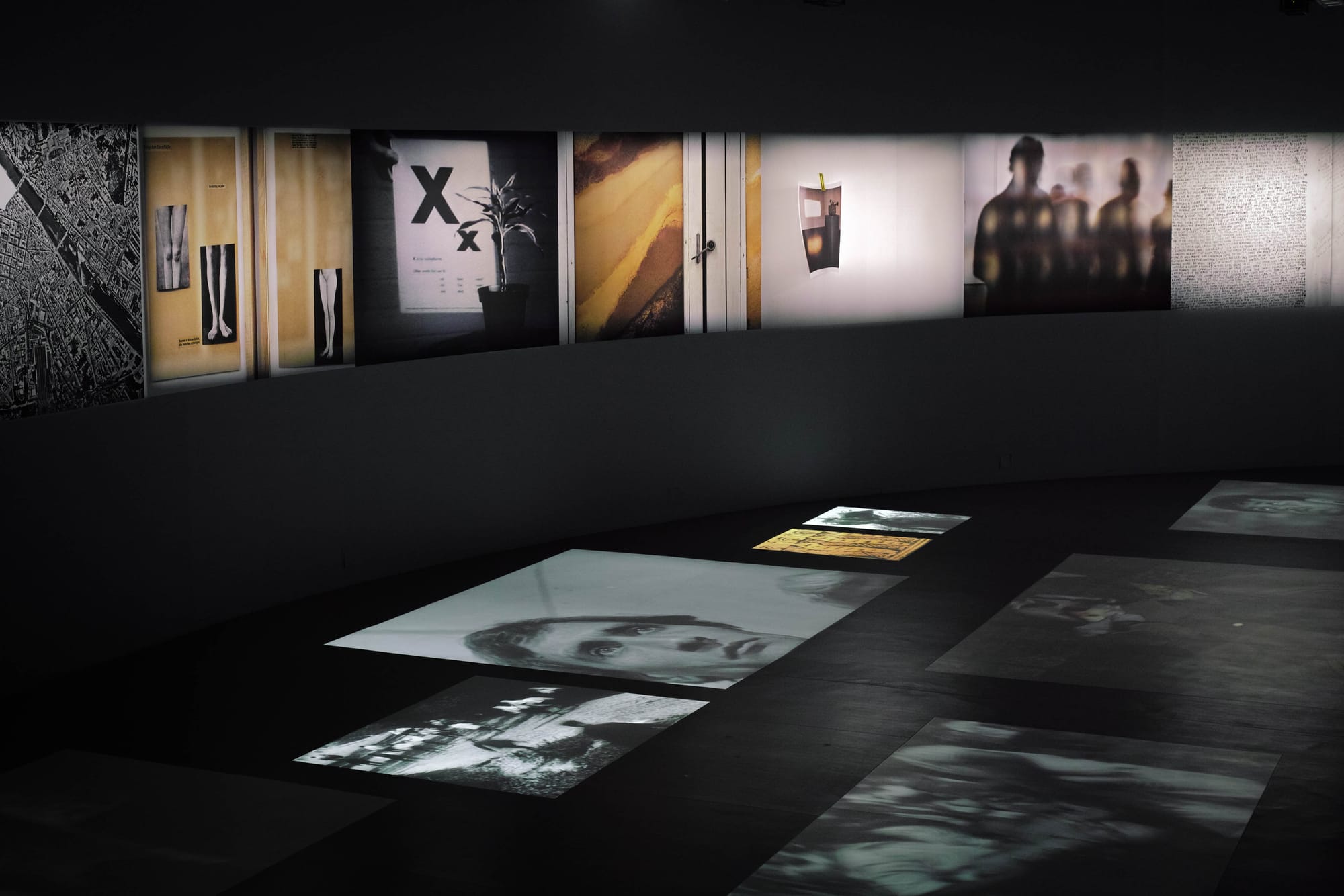 La scénographie du lieu parle en premier au spectateur. Il est accueilli en hauteur sur une coursive dans un espace jouant avec les sens, entre les diverses vidéos projetées au sol et le son — distillé avec subtilité —, le tout discourant en continue. S’étalent des extraits de films (Passolini, Eisenstein, Godard) ou encore de vidéos d'art (Bas Jan Ader), comme un grand atlas démesuré sur le thème, entre autres, de la lamentation — travail inspiré du légendaire Atlas Mnémosyne de l’historien de l’art Allemand Aby Warburg.